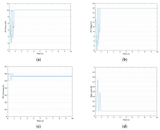 Initial particles D are set to 0.1, 0.2, 0.5, and 0.7. This is highly important as the initial execution process is to scan the full range before converging on the best solution. The duty cycle limit is also set from dmin to dmax. The setting of limitations on the duty cycle is included in the algorithm. Here, dmin is set to 0.1 and dmax is set to 0.75. The stopping criterion in this algorithm is set by assigning maximum iteration in the proposed algorithm. Here, the maximum iteration is set to 10. The other parameters are also set as follows: the P coefficient is set to 0.8, β1 is set to 1.5, β2 is set to 2.0, and υ is set to 1. In this simulation, the sampling time is 0.1 s with a sampling frequency of 10 Hz. Table 3 summarizes the parameter setting of the proposed algorithm.