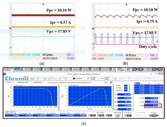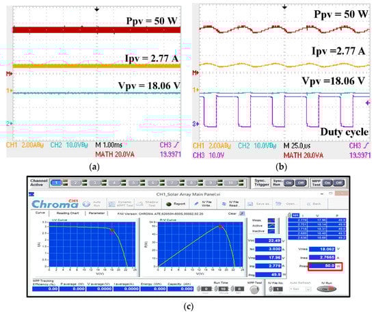 where Rm(max) denotes the resistance at the maximum power point at maximum irradiance, Dmin is the minimum duty cycle, Rload(opt) is the optimum load resistance, Rm(min) is resistance at the maximum power point at minimum irradiance, and Dmax is the maximum duty cycle. The determination of the range of the load resistance is crucial to ensure the maximum power transfer is achievable. The output voltage of the boost converter is determined by Equation (6) [].