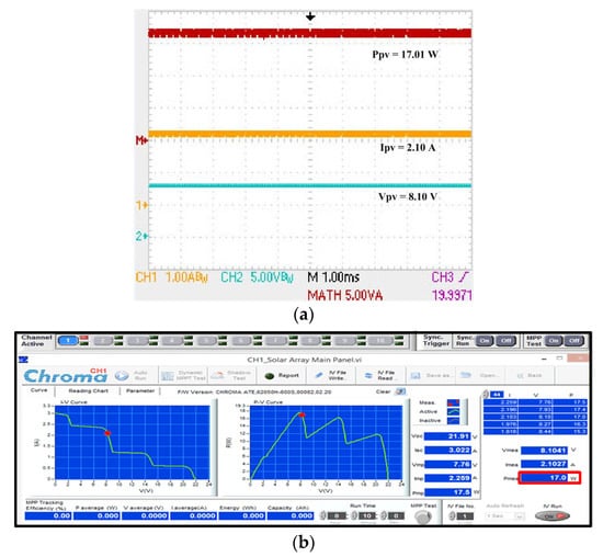 Further testing is conducted under PSCs as described in Table 4. The shadow patterns are created as in Table 4. Non-uniform irradiances are penetrated into PV modules as in Table 4 to generate a pattern for PSCs. Based on Figure 8b, the global maximum power point is 17.5 W for PSC 1. Here, the proposed modified LFO is tested. Figure 13 shows the simulation results of the proposed modified LFO algorithm under PSC 1. The results show that the proposed algorithm can track GMPP at 17.5 W. The algorithm is stable, and no steady-state oscillation is observed.
