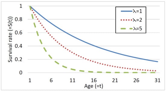 Figure 1 illustrates three possible survival curves generated by a Weibull decay function where t is the age (the x-axis). The y-axis represents the probability that a component will survive (i.e., not fail) t time units (e.g., months). and b are parameters. is known as the rate parameter in a Poisson process, and is related to the expected number of events occurring in a bounded region of time. In our case it represents the failure rate. The b parameter is known as the hazard rate. This parameter depicts the instantaneous rate in which events occur. The three curves plotted in Figure 1 correspond to the case that and three values of the parameter. Note that small is associated with a higher probability to survive longer, whereas large results in a lower probability to survive for a long time. An increasing hazard rate is appropriate since we expect younger components to be more likely to survive, i.e., to have the derivative of the survival function decrease as the component’s age increases.