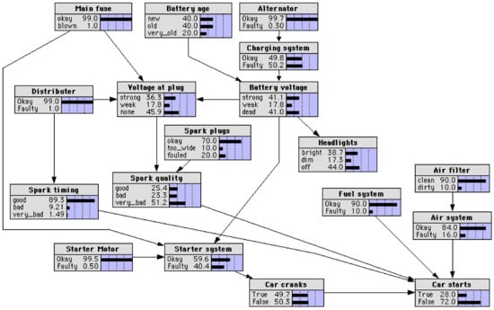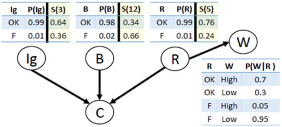 Now, assume that the ages of the ignition (), battery (B), and radiator (R) are 3, 12, and 5 months, respectively, and that they all follow an exponential survival curve . Thus, based on the components’ ages and the survival curves the probabilities of , B, and R being faulty are 0.24, 0.66, and 0.36, respectively. By adjusting the priors for , B, and R using Equation (1) and the given survival curves, we get the priors shown in Figure 2. Setting these priors dramatically affects the result of the Bayesian inference, where now the probabilities of , B, and R to be faulty are 0.16, 0.56, and 0.28, respectively. As a result, a troubleshooter that is aware of both BN and survival curves would choose to sense the battery (B) rather than the radiator (R).