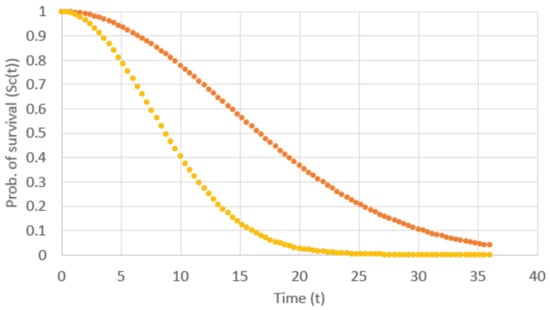 Figure 6. Two Weibull curves, one for a new component (upper) and one for a fixed component (lower). - Cost ratio. This is the ratio between and . The range of cost ratio values we experimented with was guided by the idea that the fix–replace ratio would be higher than 1 because usually replacing is more expensive than fixing a component.