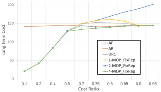 Figure 8 presents the long-term costs as a function of the cost ratio (the ratio between replacing and fixing costs). When the cost ratio is small, fixing is significantly cheaper than replacing, and thus the AF algorithm performed best. On the other hand, when the ratio is high, there is a small difference between the cost of fixing and replacing, but a new component is less likely to fail than a used component, and thus always-repair performs best. In both cases the N- algorithm achieves the same cost as fixing for small ratio and as replacing for high ratio. In between, the N- algorithm significantly reduces the cost compared to the baseline algorithms and the DR1 algorithm.