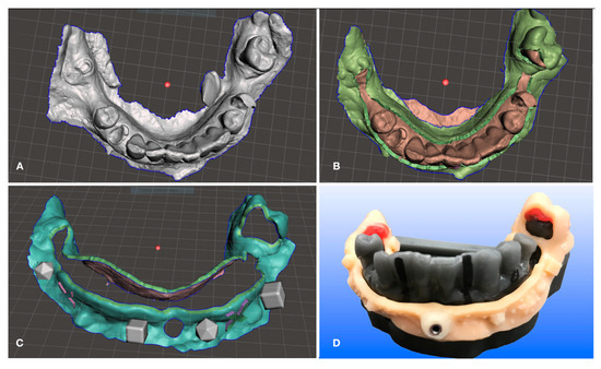 Design of the lower acrylic resin jig. (A) The digital lower scan is imported into Autodesk Meshmixer (Autodesk Inc., San Rafael, CA, USA) to design the digital index which will later serve to superimpose mandibular preoperative and postoperative scans. (B) The inferior digital index is designed in order to obtain stability thus proving occlusal clearance on all teeth but the lower second molars and providing the space for a frontal median stabilization pin. (C) Cubic and tetrahedral reference points are positioned to ease the match between the preoperative and the postoperative scan. (D) The digital index was printed using a monochromatic LCD 3D printer (Liquid Crystal Precision 1.5, Photocentric, Phoenix, AZ, USA) with XY resolution equal to 47 µm and Anycubic Dental Non-Castable UV Resin (Anycubic Shenzhen, Guangdong, China). In the picture it can be seen on the lower 3D printed model (Form 3B, Somerville, MA, USA) that was printed using Gray Model Resin (Form 3B, Somerville, MA, USA) with the same printing resolution. The guided anchor pin sleeve (Nobel Biocare AB, Gothenburg, Sweden) was secondarily fixed with the dental composite in the anterior hole left for this purpose in Mesh Mixer computer aided design (see Figure C).
