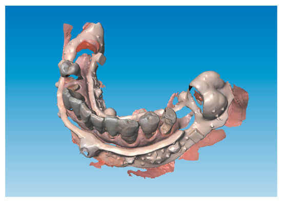 This technique allows one to change the vertical dimension of occlusion before the actual surgery using for example direct composite restorations on the existing dentition if present to test the desired vertical dimension changes for any clinical purpose (gnathological issues, collapsed vertical dimension and so forth). It is also possible to immediately determine an increase or any other kind of change in the maxilla–mandibular relationship using conventional techniques before digitally recording it. An example is the digital recording of the maxilla–mandibular relationship in the centric relation using an occlusal wax. In the case of a reduced number of occluding teeth proper stabilization of the maxilla–mandibular position into the centric relation is required using conventional methods before digitally recording the determined position by scanning. The described case did not require any change to the existing occlusal determinants. The next step consisted of the design of the lower acrylic resin jig, which is the digital index, on the preliminary lower impression (Figure 4) to superimpose the lower presurgical scan with the postsurgical impression.