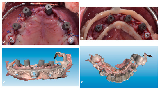 Scan abutments and the lower digital index placement. (A) Scan abutment placement after implants insertion. (B) Placement of the digital index immediately after surgery to record the postoperative digital impression. (C) Postoperative digital impression in frontal view. (D) Occlusal view of the mandibular postoperative digital impression superimposed with the preoperative scan using the resin digital index as reference.
