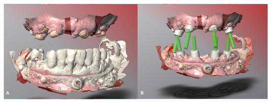 In recent years, some authors have addressed these problems [9,10], but several issues are still far from being solved. In 2019, Shao et al. [11] proposed a digital technique to fabricate an interim fixed complete-arch restoration based on the exact occlusion relationship, tooth position and tooth contour of the original dentition. Despite its high quality, this procedure may be considered invasive and at a high biological and economic cost to the patients, due to the insertion of the mini-screw and the virtual surgical planning on cone-beam computed tomography (CBCT) images. In 2020, Espona et al. [12] proposed a similar method using pins instead of a mini-screw, but without solving the previously cited invasive procedure [12].