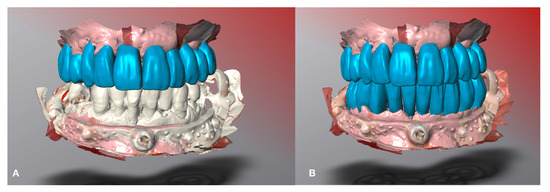 Restoration design. (A) Maxillary computer-aided restoration designed. (B) Design of the mandibular computer-aided restoration.