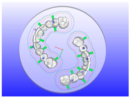 Interim superior restoration was computer-aided designed using presurgical occlusal plane as a reference. Interim inferior restoration was designed using the superior virtual interim restoration as a reference (Figure 9).