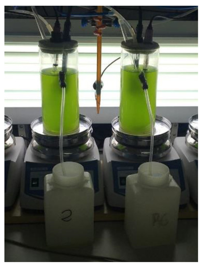 The microalgal strain used to inoculate the photobioreactors was Scenedesmus almeriensis. The stock culture of Scenedesmus almeriensis was maintained photo-autotrophically in spherical flasks (1 L capacity) using the Arnon medium [22]. The microalgal culture was continuously bubbled with CO2-enriched air (1%), which allowed us to control the pH at 8.0. The air temperature in the chamber was controlled in order to obtain a desire temperature (22 °C). The culture temperature was set at 25 °C, controlled by regulating the air temperature in the chamber. The culture was artificially illuminated in a 12:12 h L/D cycle using four Philips PL-32W/840/4p white-light lamps, providing an irradiance of 750 μE/m2 s on the spherical 1.0 L flask surface. Two laboratory-scale photobioreactors were inoculated using the culture stock. The average composition of the Arnon medium used is reported in Table 1.