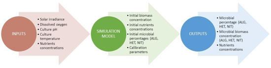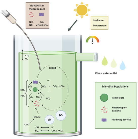 Microalgae are photosynthetic microorganisms that grow using inorganic carbon (CO2) as a carbon source, and light as an energy source. During this growth, microalgae release oxygen which can use by heterotrophic bacteria to oxidate the organic matter present in influent wastewater. At the same time, heterotrophic bacteria supply CO2 for photosynthetic activity, completing the cycle. Besides, the oxygen produced by microalgae can be used by nitrifying bacteria to oxidize the ammonium to nitrate (nitrification process), consuming CO2 as a carbon source too [10,11,12]. Since microalgae–bacteria consortia in wastewater treatment was described in 1953 by [13], multiple microalgae–bacteria models have been described and validated [14,15,16,17]. These mathematical models offer great appeal to studying microalgae–bacteria interactions because they can provide useful tools for design and control purposes, in addition to model simulators, which can all lead to an increase the process efficiency [18].