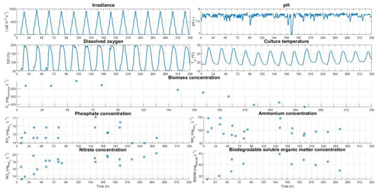 During the photosynthesis, microalgae release O2 and its consumed by aerobic bacteria respiration and microalgae respiration. The dissolved oxygen is measured and represents a model input.