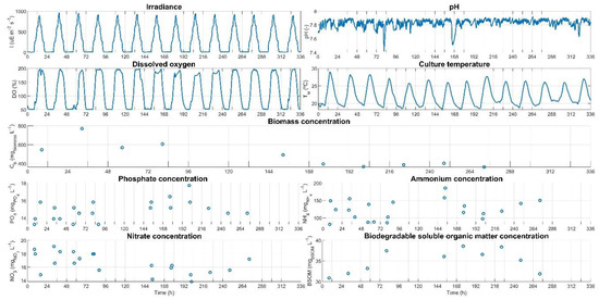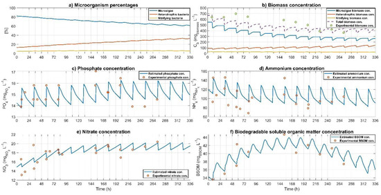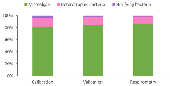 In order to validate experimentally the percentage of each microbial population proposed in the biological model, respirometric measurements were performed when at steady state. The percentages of microalgae and bacteria in the culture were estimated as functions of the microalgae net photosynthesis rate, the heterotrophic respiration rate, and the nitrifying respiration rate, respectively. These measurements were performed with handmade photo-respirometer equipment. This equipment is described in detail in [11]. The method allows one to determine the photosynthesis and respiration rates through the variations in dissolved oxygen concentrations in microalgae–bacteria cultures, as described in detail in [11].