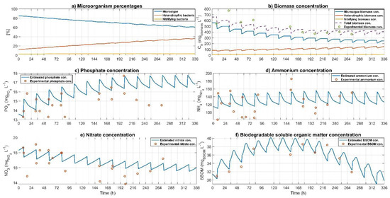 where [g m−3] is the inlet BSOM concentration, [g m−3] the BSOM concentration in the reactor, [-] represents the BSOM generation rate from microalgae, [-] is the BSOM generation rate from heterotrophic bacteria, [-] is the BSOM generation rate from nitrifying bacteria, and [-] shows the BSOM consumption rate from heterotrophic bacteria.