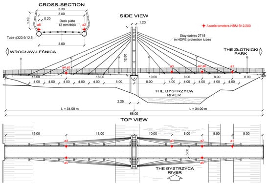 The structure selected was a 68.0 m long two-span cable-stayed footbridge named Złotnicka after its location in Złotnicki Park in Wrocław, Poland. It has central pylons to support the deck and to which the stays are attached (Figure 1 and Figure 2). Selection of the structure adhered to both technical and logistical requirements. From the technical point of view, the structure had a natural frequency in the vertical direction within the range of the pacing rates of pedestrians and presented perceptible vibrations when crossed by them. In terms of logistics, it was in quiet environment with sparse use, enabling a controlled test program to be carried out.