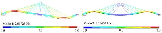 The structure was the subject of previous investigations, and detailed information regarding its geometry and finite element (FE) modeling can be found elsewhere [27]. Herein, the focus is on the properties of interest for the purposes of this paper. A measured natural frequency of 2.07 Hz was identified, corresponding to the first vertical antisymmetric mode of vibration, with a node at the central support. Relevant mode shapes are shown in Figure 3 from the calibrated FE model. The modal mass related to this mode was also calculated from the calibrated FE model and had a value of 22,205.8 kg. By employing the natural frequency and the modal mass, the modal stiffness was calculated using the expression of the natural frequency of a single-degree-of-freedom system. This modal mass was scaled by considering a unity value for the maximum ordinate of the modal shape of the first mode. Regarding damping, the value was obtained from the tail end of the pedestrian tests and is discussed in the Section 3.