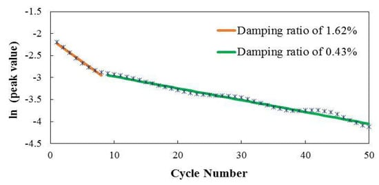 As previously mentioned, the structural damping was obtained from the tail end of the pedestrian tests, after the test subjects left the structure. This was carried out by adjusting straight lines to a plot of the logarithm of peak values of the decay versus number of cycles, as shown in Figure 5. The slope of the straight line is the damping, in terms of logarithmic decrement. However, it was soon realized that damping had a strong dependence on the vibration level, which can be seen from the variation in the slopes in Figure 5. This was also noted by comparing the damping ratios obtained from single and group crossing signals, the latter presenting higher vibration levels than the former. A collection of damping ratios obtained from several crossings are shown in Figure 6, taking as a reference the value of the acceleration amplitude at the beginning of the region of the decay signal that was employed for the respective calculation.