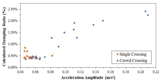 The DLFs were, thus, obtained by adjusting the numerical vibration signature to the respective measured one for several crossings of each pedestrian. A trial-and-error strategy was adopted according to the following rules of thumb: (a) changes in the value of the DLF affect only the amplitude of the response signal; and (b) changes in damping affect both the shape and the amplitude of the response signal. Damping ratios were adjusted to values of around 1.6% in the majority of cases. The selection of this value for damping was based on observed acceleration amplitudes during the crossing and the corresponding values for the damping ratios shown in the plot of Figure 6.
