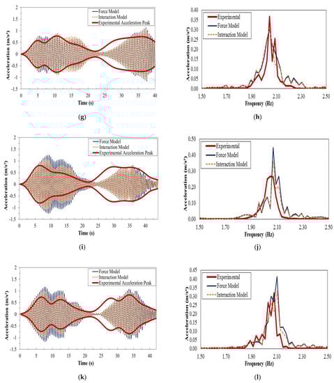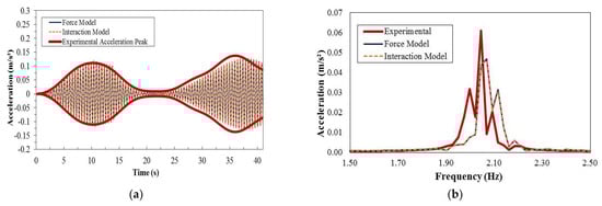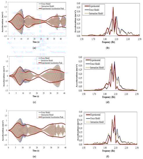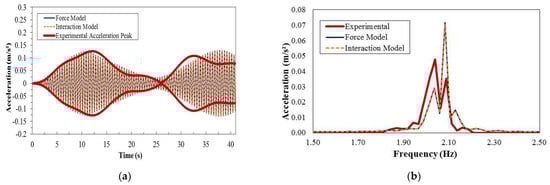 Intra-subject variability is also expected, as shown in Figure 7 and Figure 8, which show the results from two crossings of the same test subject. Another feature that can be observed from these figures is that for the single crossings and vibration levels with peak values of around 0.15 m/s2, no substantial changes in the vibration response are noted in either the time response or spectrum between force-only and dynamic (interaction) models that represent the pedestrian action. It can also be noticed from both the time domain and spectral plots that a perfect match between measurements and simulations is not present. This is possibly related to the nonlinear behavior of the structure, as it was previously seen that damping is strongly dependent on amplitude levels, which vary throughout the crossing.