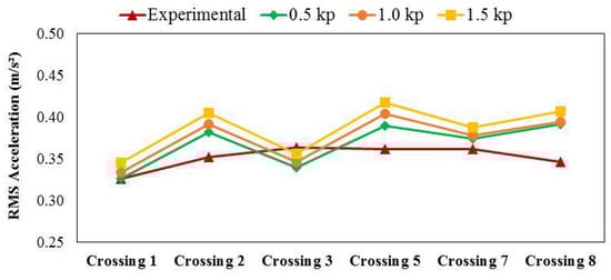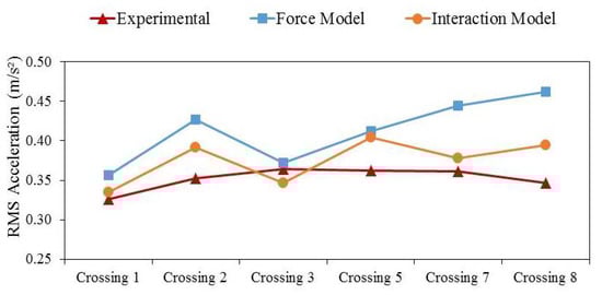 The summation of absolute errors between the values of each numerical simulation and the experimental values confirms the visual impression of Figure 10 that the performance of the interaction model was superior. However, the difference between the results of force and interaction models is not very significant. The association between the level of vibration and the number of test subjects is a factor of relevance in such a difference. Thus, the effect of the number of pedestrians in the group will be further explored.
