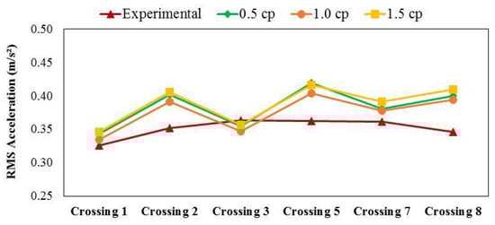 Due to these several factors, six useful crossings of the whole group of pedestrians, identified by numbers, were selected, and the identified phase differences among each test subject and the leader were introduced to the applied loads of the respective simulations. Distances among pedestrians were disregarded, following the line of thought for group loading in the UK code [14]. A value of 2.4% for the damping ratio was adopted (highest value from Figure 6), and the root mean square (RMS) acceleration during the crossing was compared between measurements and simulations. This metric was preferred since the time response and spectral signatures from measurements and simulations are not expected to match, as can be seen in Figure 9 for all selected crossings. The RMS results obtained for the selected crossings are shown in Figure 10.