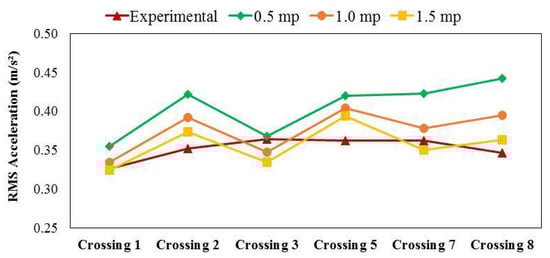 As a remark, it can be noticed from the plots in Figure 9 that the experimental peak accelerations reached during the crossings are lower than the vibration limits recommended for this footbridge, when the codes and guidelines that deal with the vibration serviceability of footbridges are applied [14,15,16].