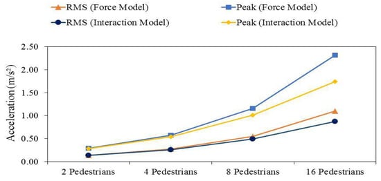 Based on the group of test subjects involved in this investigation, the average values of the pedestrian parameters were adopted, corresponding to a DLF of 0.273, an individual total mass of 72.3 kg and a crossing speed of 1.51 m/s. The pedestrians were considered fully synchronized, as synchronization would affect both modeling strategies. A word of caution is that the effect of pedestrians as dynamic systems is dependent on the level of vibration. In this analysis, peak accelerations changed from 0.29 m/s2 for the case of a group of 2 pedestrians to 2.32 m/s2 for the case of 16 pedestrians in the group. The results obtained are shown in Figure 14 in terms of the peak and also RMS acceleration.