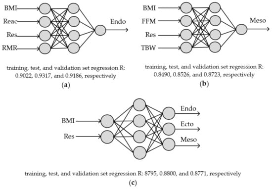 This is to our knowledge the first study that specifically develops and applies ANNs to predictive equations for young women and opts for using also raw BIA variables to estimate somatotype. Due to the lack of results using ANNs for somatotypes in existing literature, discussion of our result is not possible. Therefore, we decided to test the accuracy of existing BIA-based formulas (Table A1) using our data. In recent years [51] using raw BIA-data have gained attention due to their association not only with FFM, but also markers with extracellular/intracellular distribution of water, BMC, integrity and muscle quality. Also, raw BIA-data as resistance (R), reactance (Xc) and phase angle (PhA) could be treated as indices of biological variables [52]. A few existing BIA-based formulas to calculate endo- and mesomorphy ratings [19,20,21,22,23,24] based on the value of resistance at 50 kHz, BMI, body weight, fat mass and fat free mass, as well as gender and age were considered.