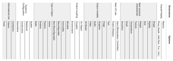 The options in the each dimension of the design space are not meant to be mutually exclusive, even though we may want to highlight some aspects of the tangible by considering one option instead of another. The (partial) exception is on the type of object dimension where options are mutually exclusive within the pair (movable/immovable, reconfigurable/non-reconfigurable, active/passive, dynamic/static).