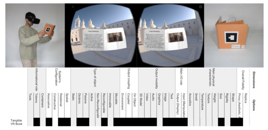 Tangible User Interface (TUI) represents a huge potential for Virtual Reality (VR) because tangibles can naturally provide rich haptic cues which are often missing in VR experiences that make use of standard controllers. We are particularly interested in implementing TUIs for smartphone-based VR, given the lower usage barrier and easy deployment. In order to keep the overall system simple and accessible, we have explored object detection through visual markers, using the smartphone’s camera. In order to help VR experience designers, in this work we present a design space for marker-based TUI for VR. We have mapped this design space by developing several marker-based tangible interaction prototypes and through a formative study with professionals with different backgrounds. We then instantiated the design space in a Tangible VR Book which we evaluate with remote user studies inspired by the vignette methodology.