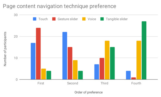 Only a few participants (five) provided explanations as to why they ordered the techniques in a given way. Regarding the gesture slider, one participant said that “for a book concept … [the gesture] seemed adequate”, while another justified the choice with the familiarity with the gesture. We hypothesise that participants associate the sliding gesture to e-book readers and hence feel it is familiar and appropriate for a virtual book. One participant that chose the touch technique as the first option, justified it with the importance of the physical touch. Although physically touching the book was not strictly necessary, our choice of words when describing the technique implied that touching was necessary, unlike in the gesture slider technique. This participant felt that touching would be an important aspect of the experience. We were disappointed that the tangible slider was the least preferred technique. To us, this was the technique that was more in line with the idea of a tangible interface and the one that provided the richest haptic experience. However, the results seem to indicate that it is not appropriate as a page content navigation technique in this context.