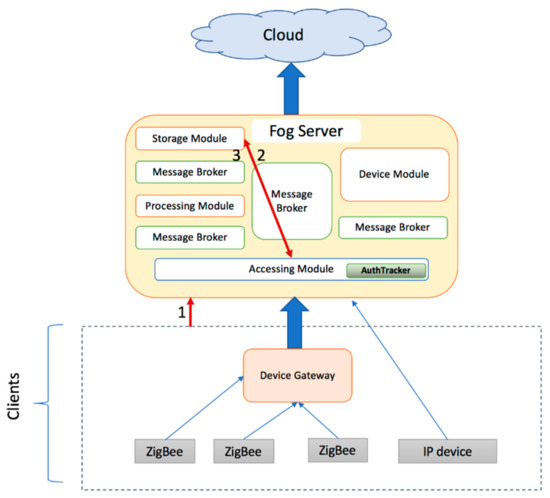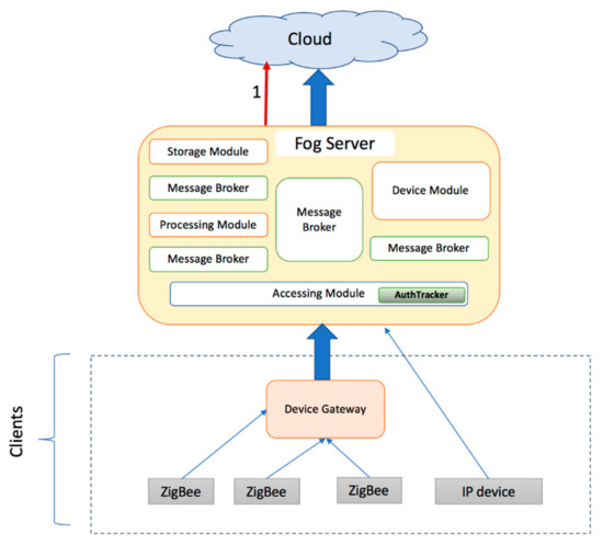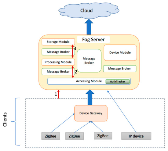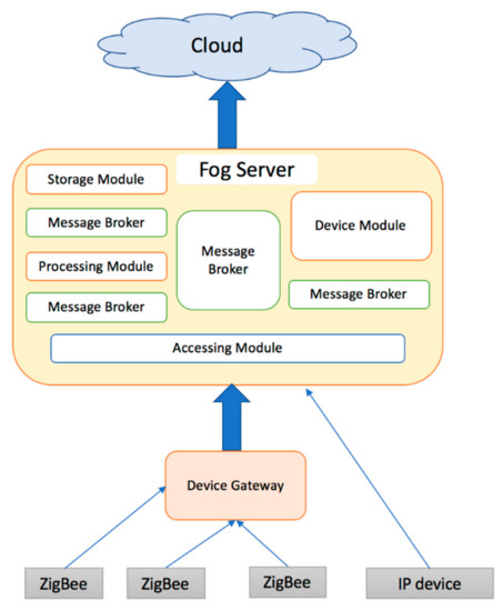 The general architecture of the fog server is shown in Figure 2. The fog server consists of six main modules: accessing module, device module, storage module, security module, processing module, and logic controller (i.e., message broker).