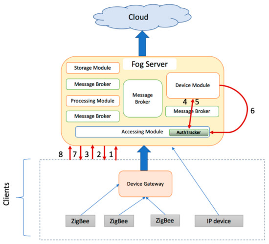 - A client sends a request to the fog server that will be authenticated first by the AuthTracker (quick authentication).