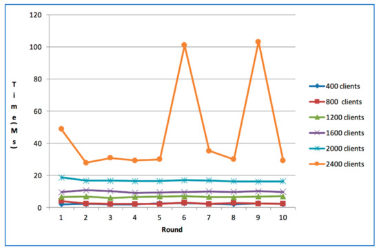 To set up our experiment, the network limitation regarding the number of connections that a fog server can receive is evaluated. The findings of this experiment will be considered as the guideline for the next experiments. Clients are simulated by iFogSim [25] which is considered as one of the most popular fog computing simulation tools to simulate fog environments and IoT data. It was employed to create connections and send requests to the fog server. A response will be sent back immediately from the fog server to the clients after receiving the requests. The time between sending/receiving requests/responses is called the response time. Different numbers of clients are used to measure the response time. Figure 10 shows the average response time in each circumstance. The vertical axis represents time in milliseconds and the horizontal axis represents the round which indicates the average response time of 100 times. Results indicate that the response time remains stable with 400 to 2000 clients’ connections and it starts to oscillate with 2400 clients’ connections; as the iFogSim has some limitations regarding the number of network links and limited network usage, it supports only tree-like topologies. Therefore, 2000 clients were used to perform the next experiments.