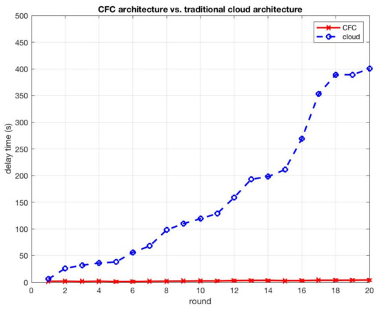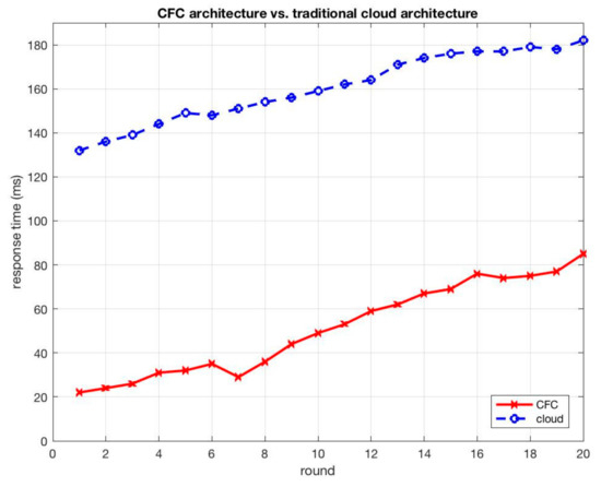 As shown in the figure, the response time is very high when the traditional cloud architecture is employed. It is the highest in comparison with all previous results. In our proposed architecture, the fog layer plays a key role in reducing the cloud overhead. In the traditional cloud computing architecture, there is no fog server and the cloud is responsible for all functions provided by that server (i.e., in CFC framework, fog server sends only selected data to the cloud for analysis and long-term storage).