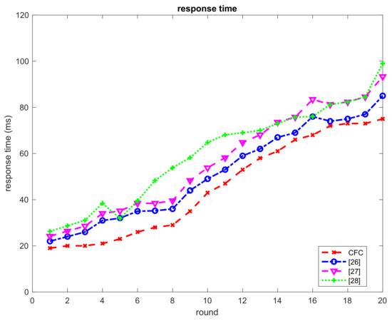 We measured the response time of these 400 clients who sent query requests regarding getting the newest data. The response time means the time difference between sending the request and receiving the response. Note that when requesting the newest data, the fog server will return the response. In contrast, requests that query historical data need a connection with the cloud. In this experiment, the response time and the delay time of the proposed framework were compared with three fog computing-based frameworks [26,27,28] that were published in the GitHub website [29].