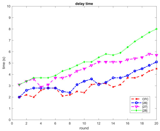 Figure 13 and Figure 14 show the average time delay of a query relating to the newest data (i.e., the average time delay of 400 query/round). The vertical axis represents time in seconds and the horizontal axis represents the round. The time delay indicates the time between sending/receiving the request/response. Thus, the time delay specifies whether the received data are the newest data or not. For example, 2 s time delay indicates that the data which the client had received were the data uploaded before 2 s. Results show that the time delay ranges from 1 to 4 s for the proposed framework.