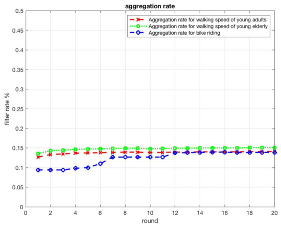 Figure 16 shows the aggregation rate of the proposed framework. It indicates the aggregation rate for the walking speed of young adults and for elderly people. It also shows the aggregation rate for bike riding.