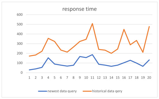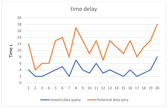 Figure 18 shows the average time delay of a query for the newest and the historical data (2400 clients were simulated). The vertical axis represents time in second and the horizontal axis represents the round. The time delay indicates the time between sending/receiving the request/response. The average delay time of newest data query ranges from 2 to 8 s, while the average delay time of historical data query ranges from 4 to 18 s.