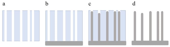 Ag-NWs array on TM was manufactured in the following way. A thin silver coating of 50–70 nm was deposited on one side of the TM (Figure 1a) by thermal vacuum deposition to create a conductive layer. Then, a metal layer with a thickness of about 10 μm was electrochemically deposited on the silver-coated side of TM (Figure 1b) [32]. The next step was the electrochemical deposition of silver using the commercial silvering electrolyte (KLIO Company, Russia) into the pores of the TM (Figure 1c). The deposition was carried out in galvanostatic mode at a constant current value of 10 mA. In the process of metal deposition, the cell voltage was monitored by Elins P30S potentiostat (Chernogolovka, Russia), that allowed it to set the length of the NWs during the growth process. The length of NWs was varied from 500 nm to 12 μm. At the end of the galvanic deposition process, the TM with an array of Ag-NWs inside its pores was washed from the electrolyte and then etched in a concentrated alkali solution (6 M NaOH) at a temperature of 60 °C (Figure 1d). After the template etching, the metal substrates with the array of Ag-NWs were washed in distilled water.