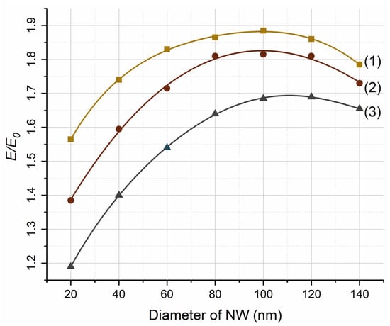 Simulated dependence of the normalized electric field amplitude (E/E0) on the Ag-NW diameter at various distances from its surface: (1) 2.5 nm; (2) 5 nm; (3) 10 nm.