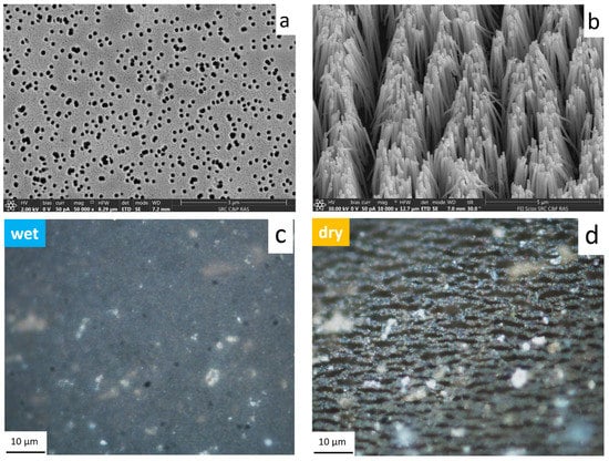 The substrate drying process and the characteristic leaned microstructure can be observed in real-time mode using an optical microscope. Figure 3 shows photos of the substrate surface with the Ag-NWs length of 12 μm in a wet form (Figure 3c) and after air-drying (Figure 3d). At the moment of complete drying of the substrate, surface tension will cause the Ag-NWs to lean towards their nearest neighbors, thus creating bundles. The length of the Ag-NWs was investigated by scanning electron microscopy (SEM) (Figure 3b). It also should be noticed that the morphology of the produced SERS totally reproduces the structure of the using TM (Figure 3a).