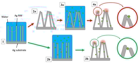 Schematic procedure for the gap hot spots formation on the array of Ag-NWs bundles in case of the «dry» and «wet» SERS-substrates. (1) The array of Ag-NWs on a metal substrate is being in the water after etching of TM. (2a) as distilled water was evaporated, Ag-NWs were leant together by its tips due to the capillary force. (3a) An analyte was added on the already formed Ag-NWs bundles, so the analyte molecules could not be in the spacing between neighboring Ag-NWs tips and consequently in the gap hot spot region (4a). (2b) an analyte was added on wet substrates. (3b) Molecules of an analyte were adsorbed on the entire length of the Ag-NWs, and during the Ag-NWs leaning, the molecules were trapped in the gap hot spot region.
