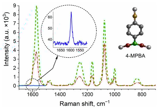 SERS-spectra of 10 μg/mL 4-MPBA adsorbed on the “wet” (green dash line) and “dry” (red dash-dot line) substrates with 1.1 μm Ag-NWs. For comparison the ordinary Raman spectrum of 4-MPBA is shown (blue solid line): brightest Raman spectral peak at ~1600 cm−1 (in enlarged scale in the dashed circle insert). On the insert chemical structure of the analyte molecule is shown.