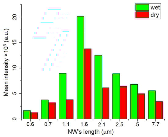 To demonstrate the effect of various mechanisms on the amplification of the analyte SERS-signal, a series of samples with different Ag-NWs lengths were tested. The substrates were divided into three groups along the Ag-NWs length. Each group was split into “dry” and “wet” (Figure 4). “Dry” substrates were obtained by drying the substrate immediately after the TM removal and the following washing, while the “wet” ones were left in distilled water until the analyte exposure.
