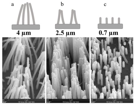 Feature of the leaning of the 100 nm diameter Ag-NWs, depending on their length. (a) shows that sufficiently long NWs form the bundle, while so-called “middle-sized” NWs form the point contact between their tips (b). NWs with the length of fewer than 1 μm are not leaning due to its short length (c).