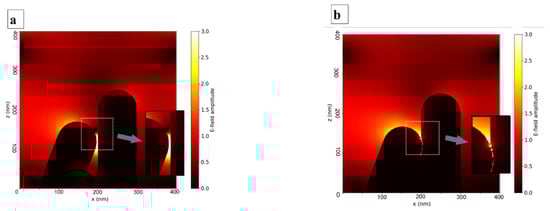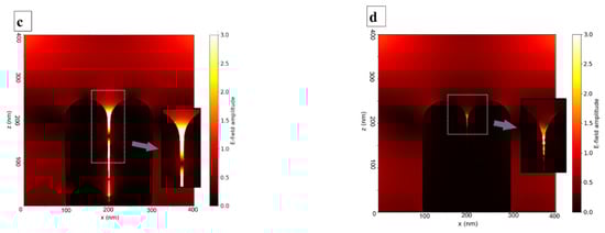 The case of the leaning geometry, demonstrated by the example of “medium-sized” NWs, is extremely promising. Depending on the angle between neighboring NWs, the E/E0 can be widely varied. This geometry leads to the concentration of electromagnetic energy in a narrowing gap between NWs and to the formation of a plasmon in it with several regions of electromagnetic field amplification, with a maximum E/E0 equals 74.5 for the case of “wet” substrate (the opening angle of the NWs in the calculated case is equal to 2 degrees). E/E0 is of 20 for the “dry” one in case of “medium-sized” NWs (Figure 8c,d). For the “wet” substrates the enhancement is strongly dependent on the geometry of leaning Ag-NWs (angle between them, length of the gap, etc.). The E/E0 obtained for “medium-sized” NWs can be significantly enhanced due to the incident field polarization.