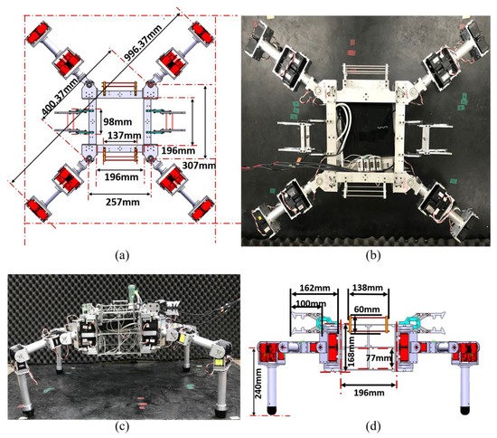 Accordingly, the four legs of the robot are designed to be identical, each consisting of an upper, middle, and lower link (Figure 2) with the yaw-roll-roll rotations. The lengths of each link from the base are 115.8 mm, 188.5 mm, and 210.0 mm, respectively. Each leg (2 kg) is structured as a circular hollow bar (diameter = 30.0 mm) made of aluminum alloy (6061-T6).