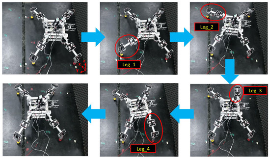 A walking test for a single robot was carried out to verify the functionality of the proposed robot. The walking sequence of a single robot was designed to mimic that of an ant. Past research on ant walking behavior reported that the walking gait of ants is divided mainly into two batches of three legs; this is known as a tripod gait because it looks similar to a tripod standing on the ground [19,20]. As such, the robot should always have three legs on the ground at any point in time to support its body. The gait pattern is designed as follows: Leg 1, Leg 2, Leg 3, Leg 4 (Figure 4). Whereas the pseudo-code for the walking sequence is shown as in the Algorithm 1.