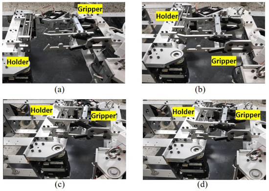 The coupling mechanisms are used in the combination process. (a) Ready to lock. (b) Contact with locking bar. (c) Semi-locked. (d) Fully locked.